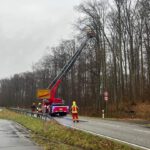 Kurz vor 9 wurden wir erneut an die Einsatzstelle vom Vortag (Einsatz Nr. 17) alarmiert. Nachdem eine Abarbeitung am Nachmittag zuvor nicht möglich war, wurden die Arbeiten am 18.02.2023 erneut aufgenommen. Durch die Seilwinde vom HLF 20 wurde der obere Teil des Baumes aus den angrenzenden Baumkronen gezogen. Dazu wurde über den Korb der Drehleiter Anschlagmittel an den losen Teil des Baumen angebracht. Nachdem die Arbeiten beendet wurden, übergaben wir die Einsatzstelle an die Polizei.